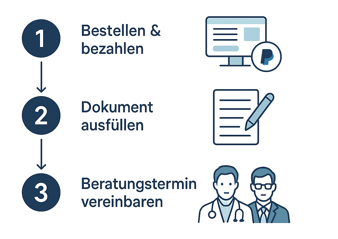 Nach dem Kauf erhalten Sie sofort den Fragebogen und können umgehend Ihren Termin buchen. Die finale Ausstellung erfolgt nach der Beratung und dauert normalerweise 2 Werktage.